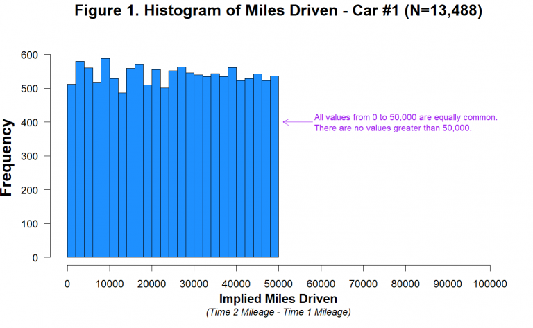Later analysis by anonymous researchers (Anonymous, 2021) showed that there was not just a failure of randomisation. The field trial data was faked. There were many indicators of this fraud, but one could be seen by simply plotting the reported odometer readings.