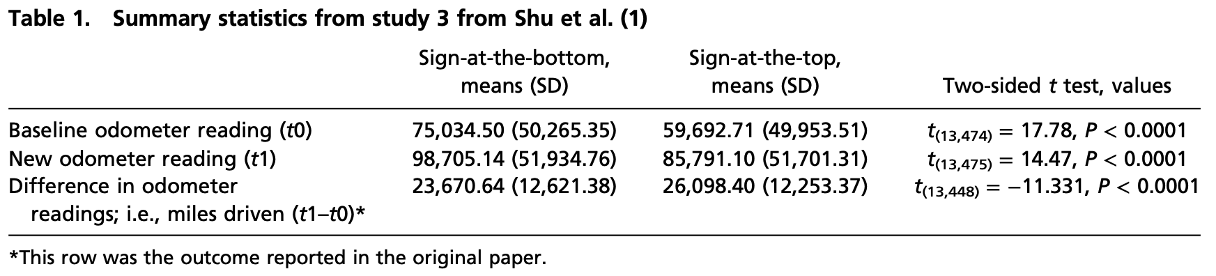 Reproduction of the field trial reported in the 2012 experiment also yielded some interesting results. Summary statistics derived by Kristal and colleagues show that the baseline odometer reading differed materially between the two groups, suggesting a failure of randomisation.