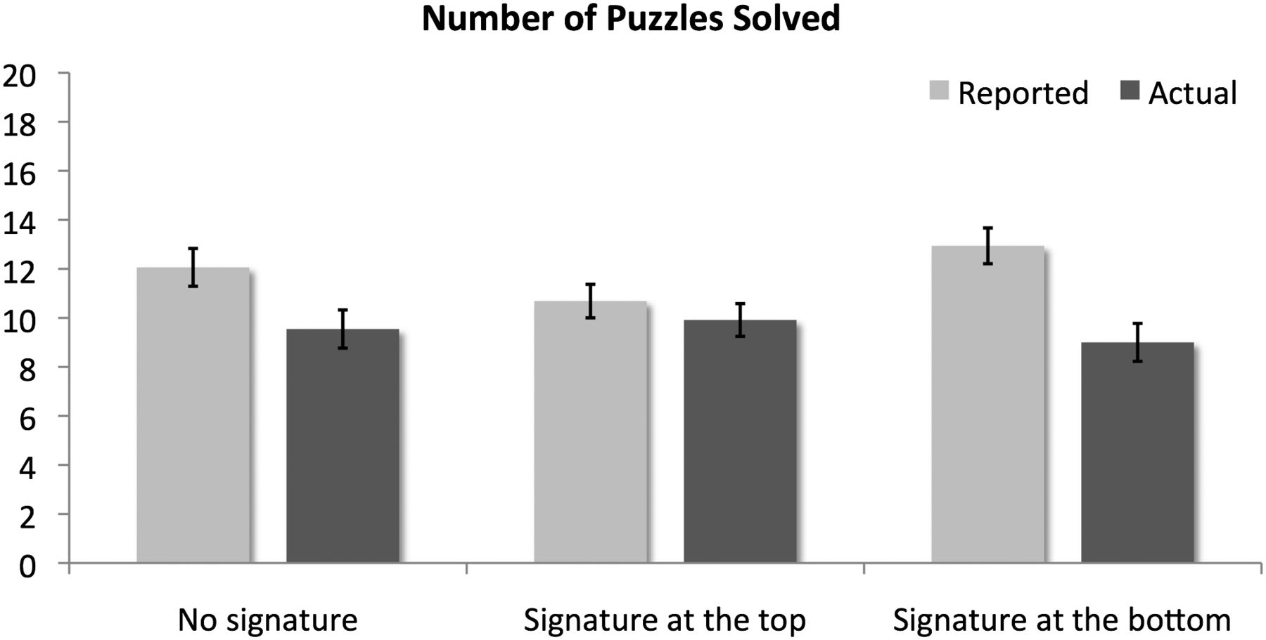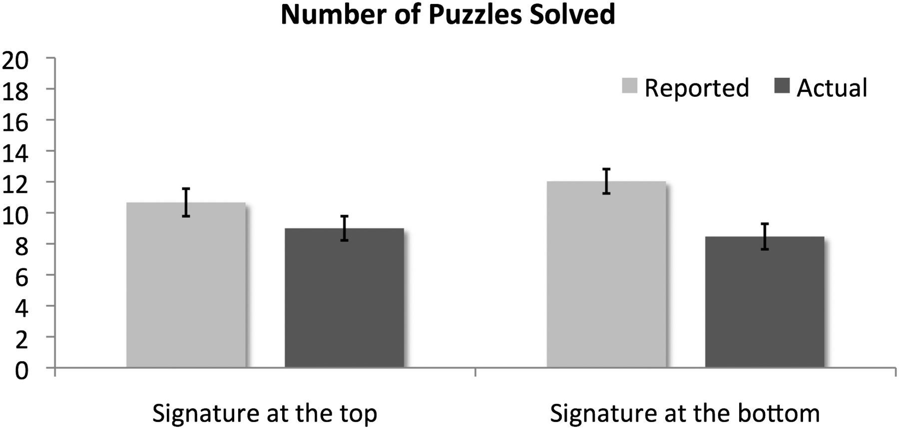 In 2012, Lisa Shu and colleagues (2012) published a paper in PNAS in which they reported that “signing before—rather than after—the opportunity to cheat makes ethics salient when they are needed most and significantly reduces dishonesty.” The paper reported the results of two lab experiments and one field experiment, all suggesting an effect. The following two figures show the experimental results, whereby experimental subjects were asked to report how many problems they had solved.